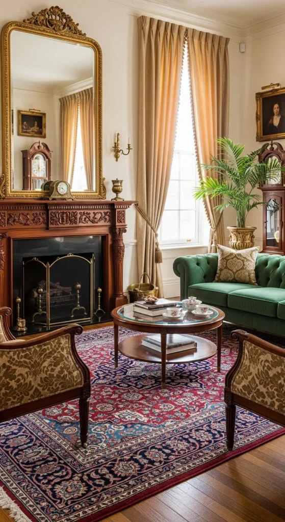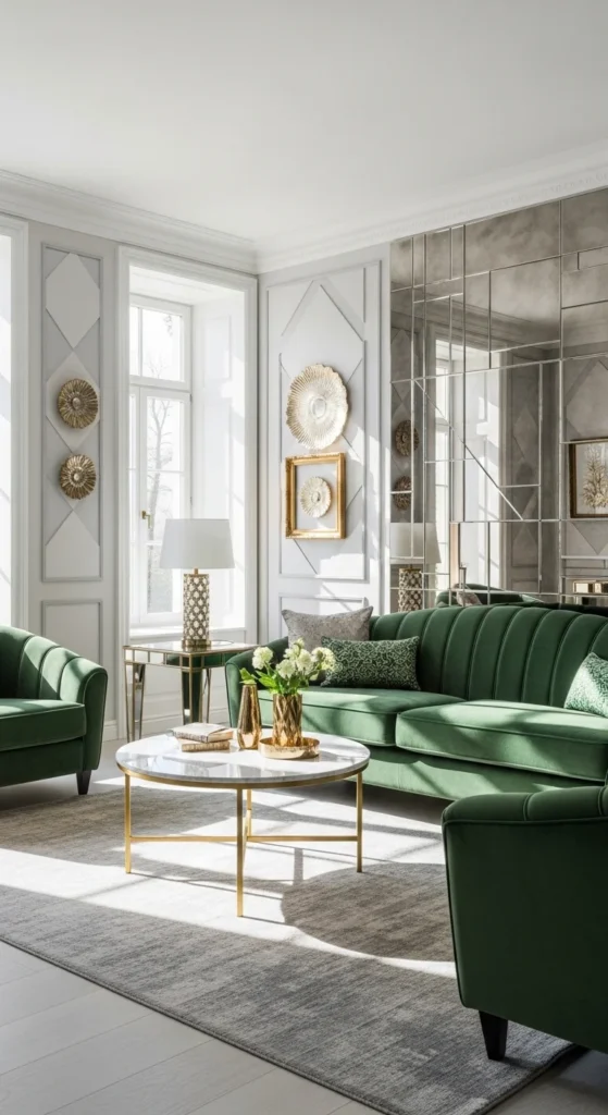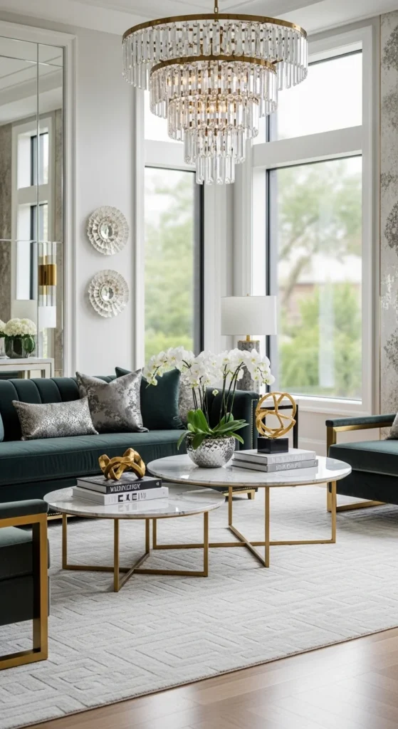 Soft velvet seating and subtle shine make this space feel special. A deep emerald sofa pairs with a marble coffee table while gold-framed mirrors reflect natural light. Crystal wall sconces add sparkle and a plush cream rug feels luxurious underfoot. Tall windows with silk curtains complete the elegant yet comfortable look that works beautifully for everyday living.