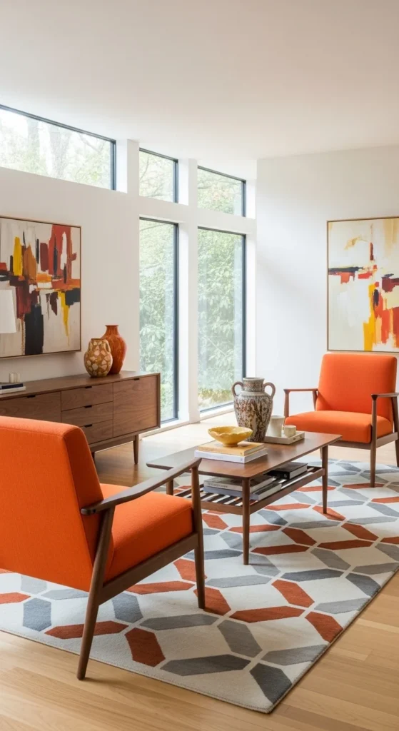 Clean lines and warm walnut wood define this cheerful design. A low-profile sofa in warm mustard yellow faces two tapered-leg armchairs while a teak coffee table sits on a geometric rug. Large windows with simple panels let daylight highlight the tapered legs and organic shapes. A statement pendant light and a few ceramic pieces on floating shelves add personality without clutter.