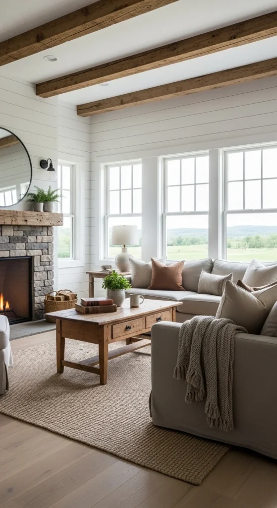 White shiplap walls and rustic wood beams create a relaxed country feel. A big slipcovered sofa in soft gray pairs with a reclaimed wood coffee table while black metal accents add contrast. A large jute rug covers wide plank floors and natural light pours through windows with simple white curtains. Open wooden shelves hold baskets and pottery for easy everyday charm.