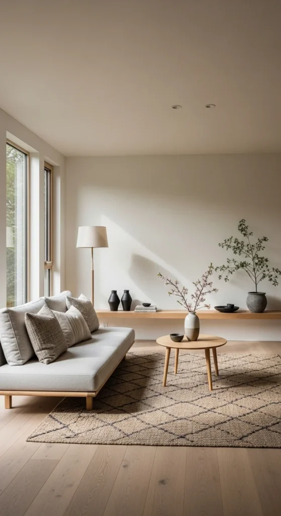 This peaceful blend of Japanese and Scandinavian styles feels wonderfully balanced. Light oak flooring and low wooden platform seating create calm lines while neutral linen textiles add softness. A simple black ceramic vase holds a single branch on the coffee table. Large windows bring in gentle daylight and a woven paper pendant light hangs above. Everything feels intentional and serene.