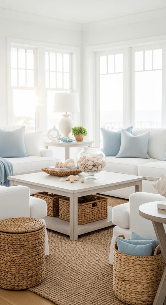 Soft blues and sandy neutrals bring the beach home in this bright design. A white slipcovered sofa faces a driftwood coffee table while a blue and white striped rug covers the floor. Natural woven baskets hold throws and large windows with sheer curtains let in plenty of daylight. Shell collections and linen pillows add gentle texture that feels fresh and airy.