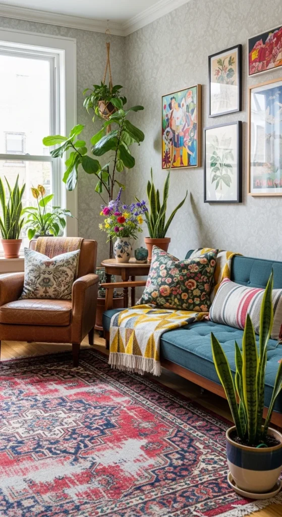 This design celebrates mixing different eras and styles in a happy way. A vintage leather armchair sits next to a modern sofa covered in colorful pillows while global textiles layer on the floor. Gallery walls display art of different sizes and lots of plants add life. Natural light highlights the rich mix of wood tones and patterns that feel personal and collected.