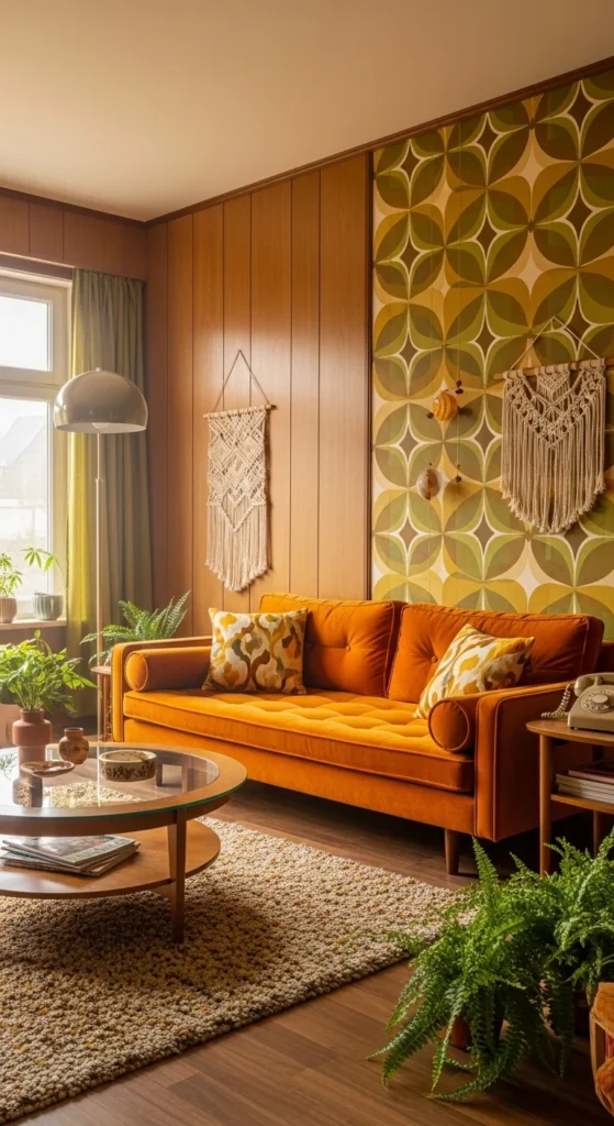 Warm wood paneling and bold patterns bring cheerful energy to this design. An olive green velvet sofa pairs with a walnut sideboard while a shag rug in warm tones covers the floor. Retro pendant lights and colorful abstract art add personality. Large windows let natural daylight highlight the curved furniture shapes and playful details.