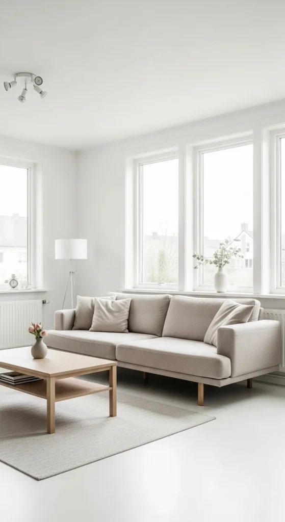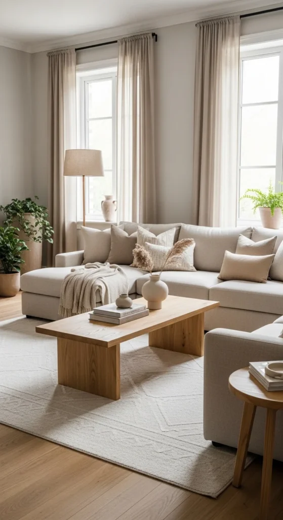 This design feels calm and spacious with simple lines and uncluttered surfaces. A low beige linen sofa sits against white walls while a light oak coffee table holds just a few books and a small plant. Natural light floods the room through floor-to-ceiling windows dressed with sheer curtains. The floor features warm oak planks and a soft cream rug. Matte black floor lamps and hidden storage keep everything tidy and peaceful.