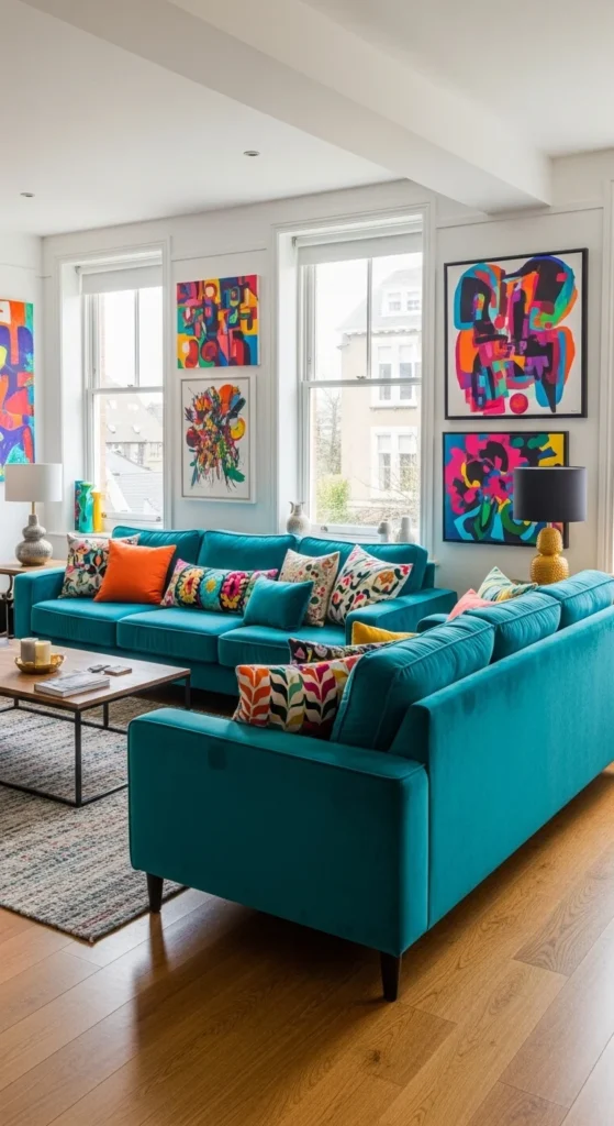 Rich terracotta walls and a deep blue sofa make this space feel alive. Patterned cushions in mustard and pink add joy while a wooden coffee table grounds the look. Modern art brings more color and natural light from big windows highlights the cheerful combination. The mix feels vibrant yet balanced for daily comfort.
