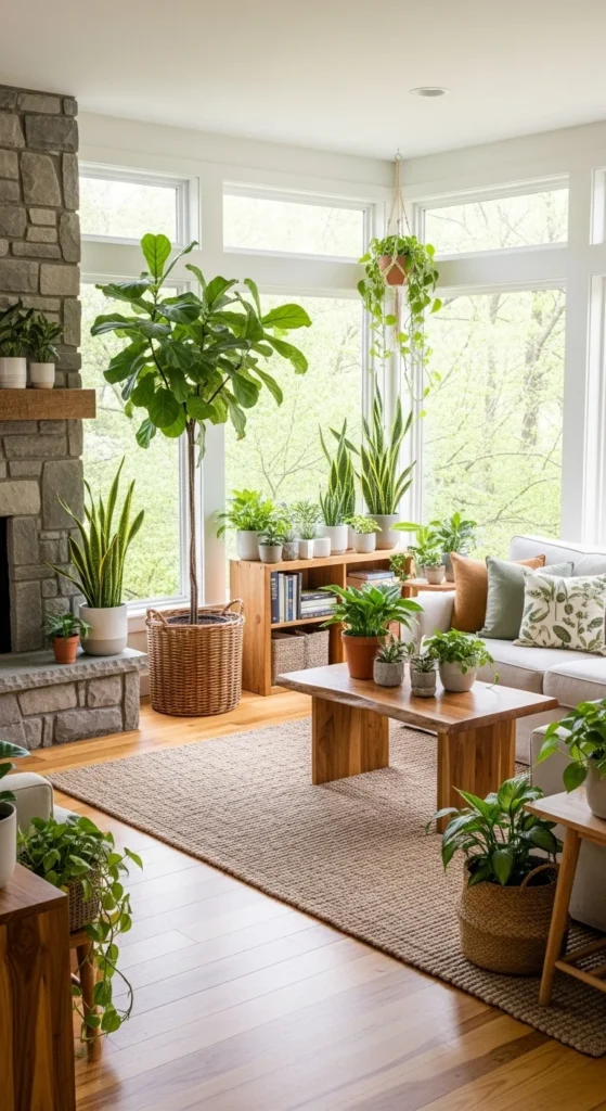 Lots of green plants bring nature inside in this refreshing design. A wooden sofa with linen cushions sits near a living wall of trailing plants while stone accents add texture. Large windows open to the outdoors and natural light makes the greenery glow. A rattan coffee table and wooden shelves complete the connection to nature.