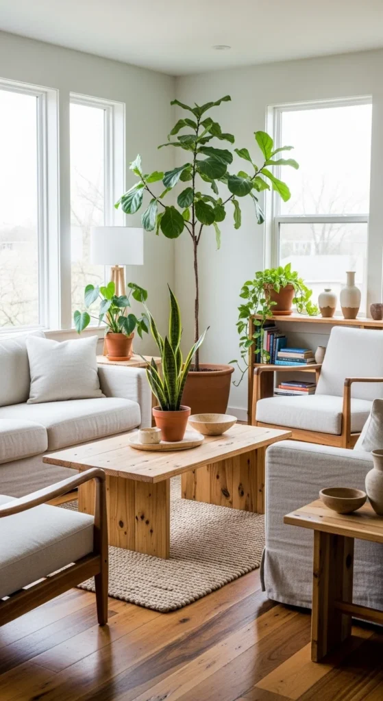 Natural materials and thoughtful choices define this warm design. A sofa made with organic linen sits on a jute rug while reclaimed wood shelves display handmade ceramics. Bamboo blinds filter soft daylight and many potted plants improve the air. The honest textures and earthy palette create a space that feels good and looks beautiful.