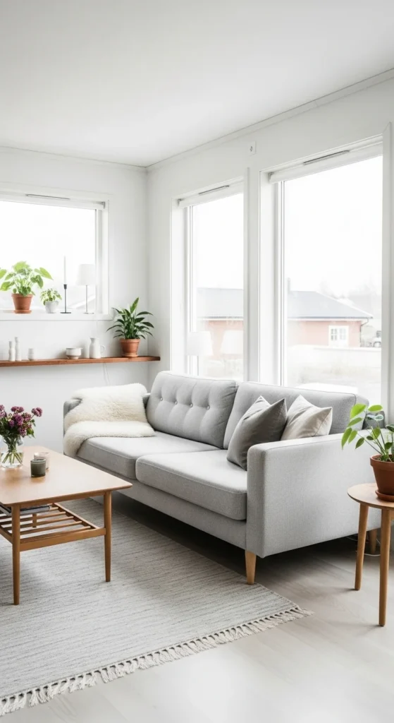 Soft gray tones mix beautifully with natural wood in this warm design. A deep gray sectional sofa faces a simple wooden media console while fluffy sheepskin throws add comfort. Pale birch shelves display a few ceramic vases and green plants. The large windows bring in plenty of daylight, highlighting the light oak floors and white walls. A round jute rug and white pendant light complete the relaxed Nordic feel.