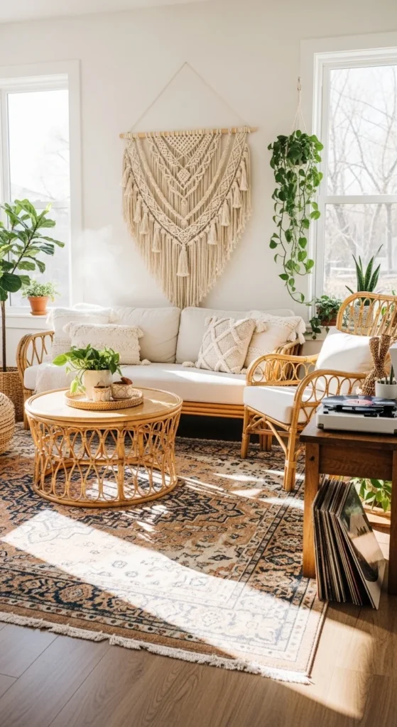 This style feels free and full of personality with layered textures everywhere. A deep terracotta sofa covered in patterned pillows sits on a colorful kilim rug. Woven rattan chairs and macrame wall hangings add warmth while lots of trailing plants bring life. Wooden bead curtains frame the windows and natural light highlights the rich earthy tones. Brass lanterns and vintage finds make it feel collected over time.