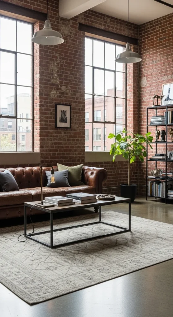 Exposed brick walls and dark metal details create a strong character in this design. A brown leather Chesterfield sofa pairs with a reclaimed wood coffee table on polished concrete floors. Black metal shelving holds books and industrial-style lamps. Large factory-style windows flood the space with natural light while a big woven rug softens the look. The mix of raw and comfortable elements feels welcoming.