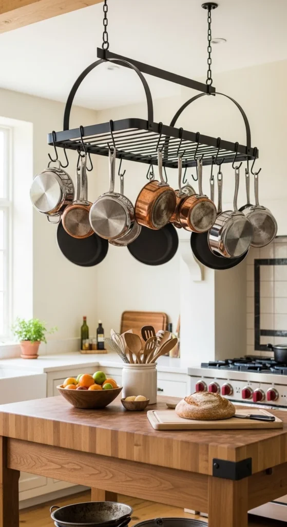 Free up cabinet space and add style with a ceiling pot rack. Mount a simple rail system or hanging rack above your workspace.