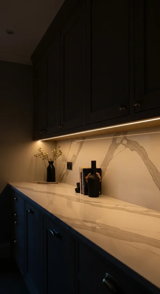 Under-cabinet lighting makes counters safer and more usable at night. Adhesive LED strips install quickly without wiring.