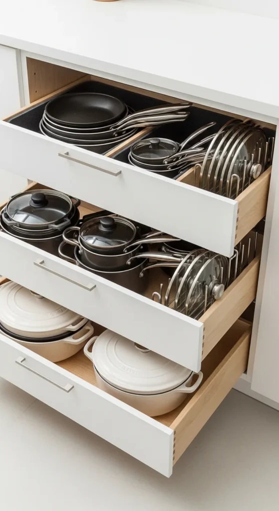 Choose sturdy options that support weight. Arrange pots by size for easy access. This vertical storage works especially well in smaller kitchens.