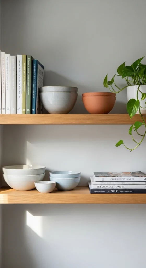 Floating shelves provide extra display and storage without bulky cabinets. Mount them securely into wall studs.