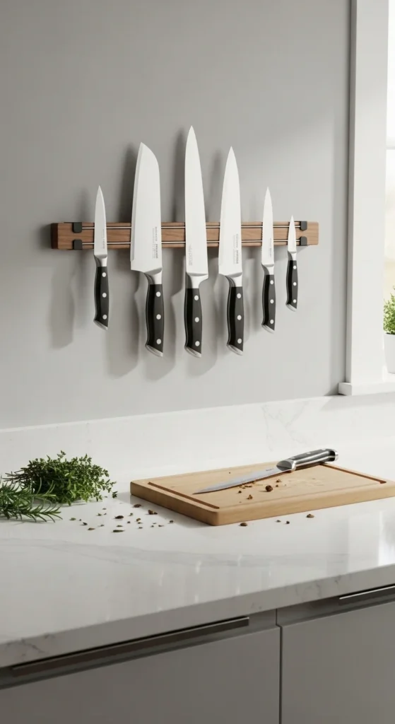 A wall-mounted magnetic strip keeps knives safe and accessible. Mount it above counters at comfortable height.
