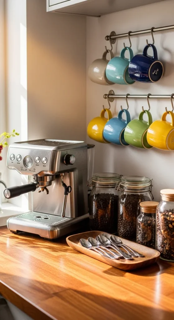 Add hooks for mugs and small shelves for supplies. This keeps counters clear and morning routines smooth.