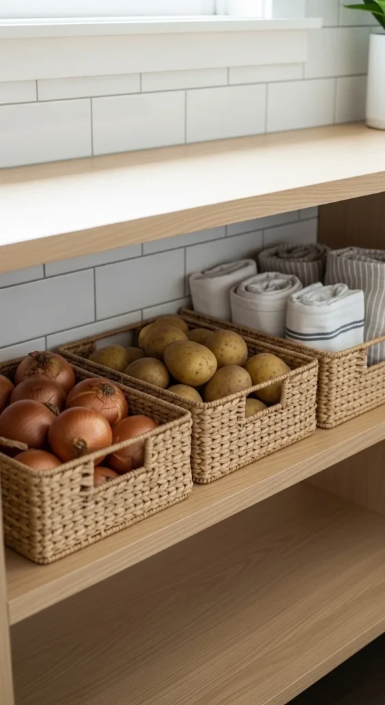 Place on shelves or in cabinets for produce, towels, or snacks. Natural materials like wicker or fabric work well.