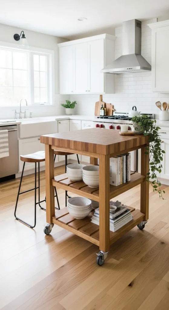 A rolling cart or small island adds workspace and storage. Choose narrow designs for tight spaces.