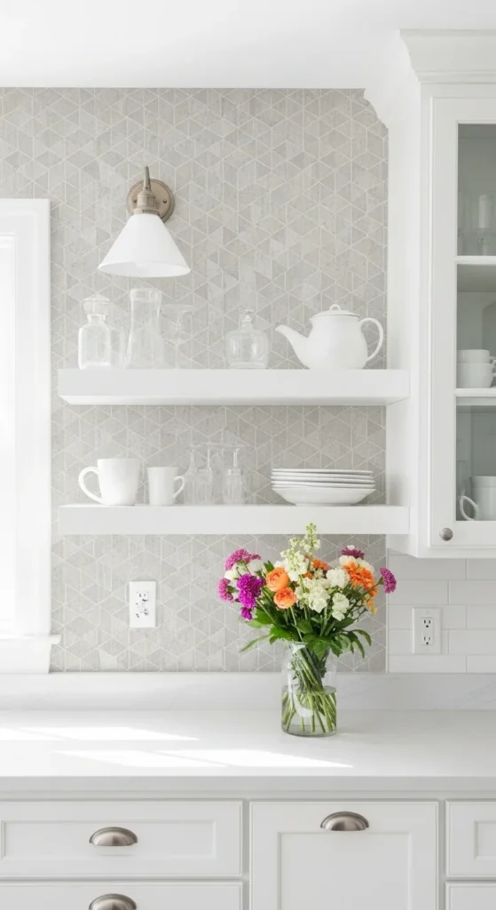 Removable wallpaper on a single wall adds pattern without commitment. Choose moisture-resistant options for kitchen use.