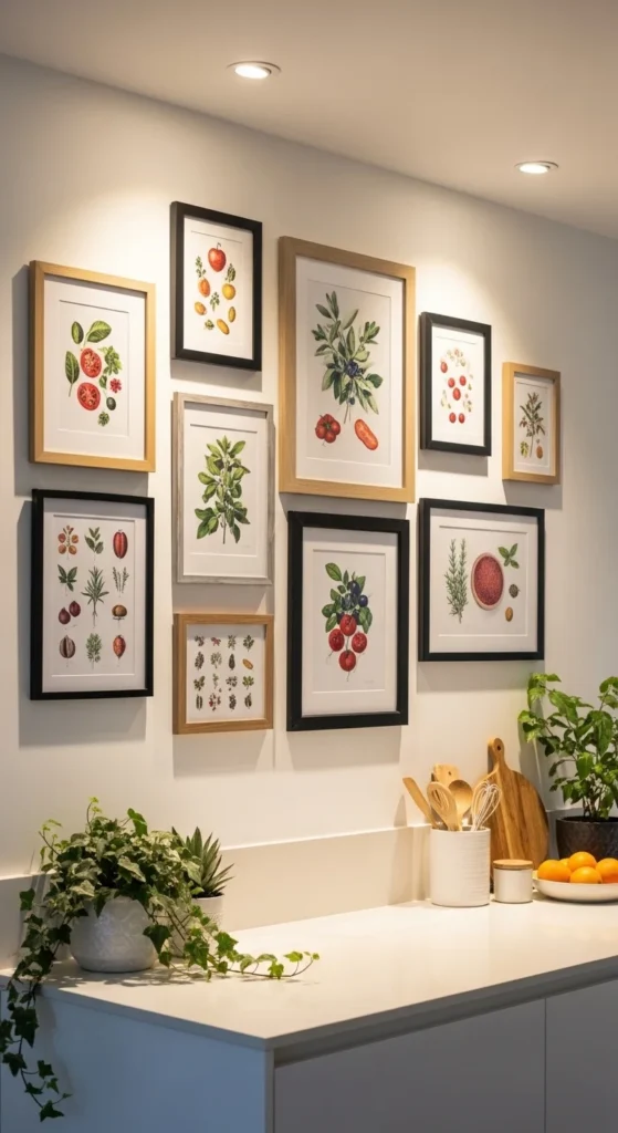 Simple framed prints or photos make kitchens feel personal. Choose moisture-resistant frames and art.