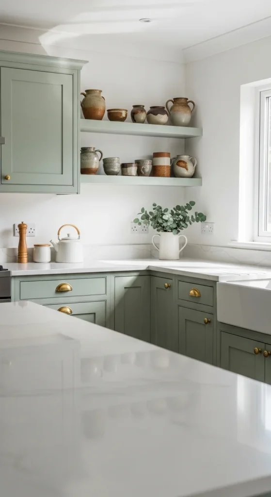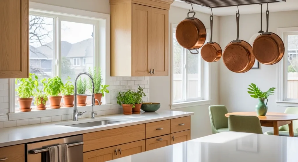 Start small and expand as confidence grows. The green elements soften hard surfaces and make the kitchen more inviting.