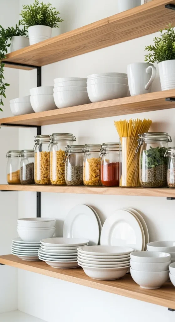 Display everyday dishes, colorful mugs, and glass storage jars. Keep items you use daily within easy reach. This setup encourages tidiness since everything stays visible.