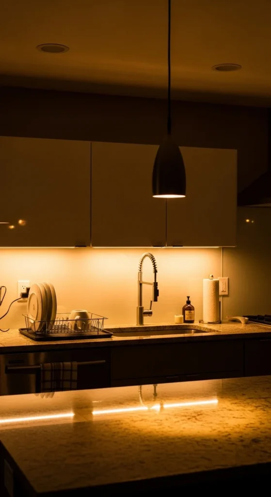 Good lighting changes how a kitchen works and feels after dark. Combine under-cabinet strips, a central pendant, and existing ceiling lights for flexibility.
