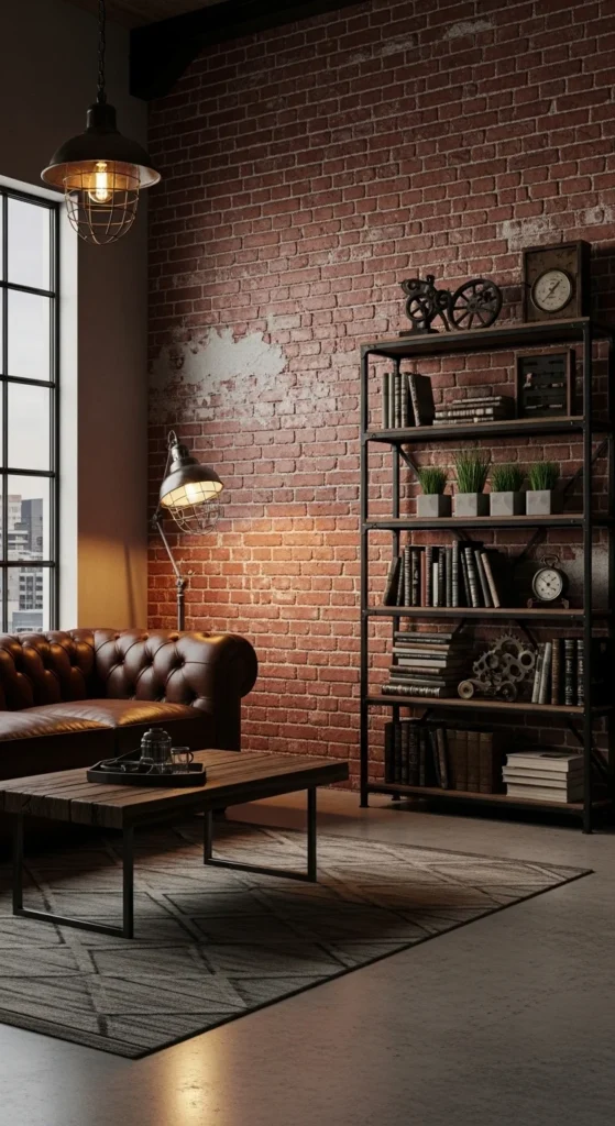 This design feels bold and full of character, inspired by urban loft spaces. Exposed brick walls or brick-style wallpaper create a strong visual backdrop. A brown leather sofa with a slightly worn look adds warmth against the raw textures. Black metal shelving and dark wood furniture give structure and depth. Lighting choices like Edison bulb pendants or matte black floor lamps enhance the mood. A few vintage-style accents complete the look without cluttering the space.