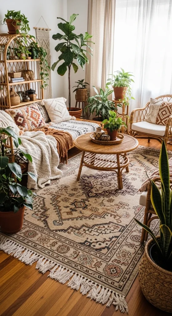 This space feels relaxed, creative, and full of personality. Layered patterned rugs and colorful cushions make the seating area feel inviting and lived-in. Rattan chairs or a woven coffee table bring in natural texture. Indoor plants in terracotta pots add life and freshness. Decorative elements like macramé wall hangings and handmade pieces give the room a personal touch. Soft lighting from lanterns or string lights creates a warm and cozy vibe.
