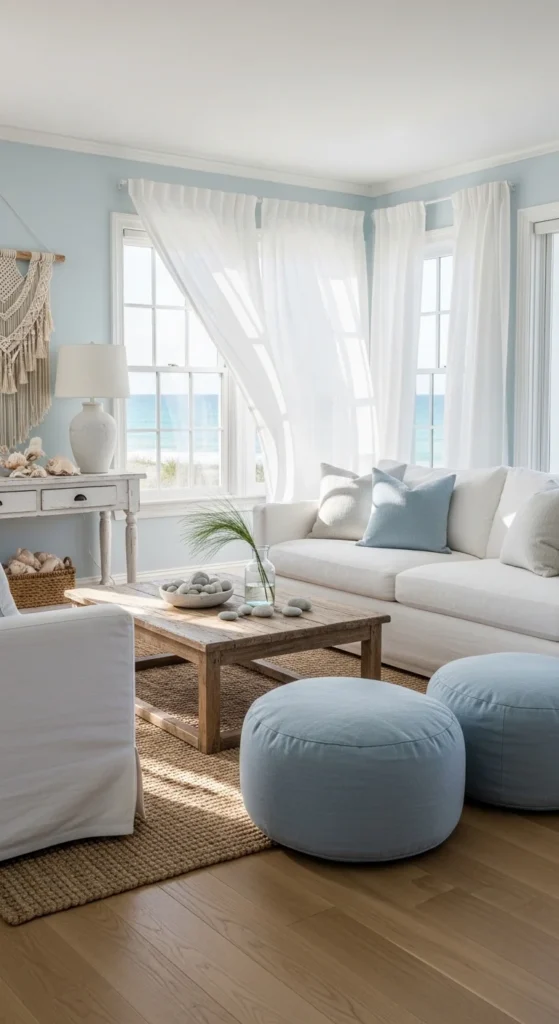 This room feels light, airy, and inspired by the calm of the sea. A palette of white, soft blue, and sandy beige creates a soothing base. Slipcovered sofas and light wood furniture keep the space relaxed. Sheer curtains allow natural light to move freely through the room. Subtle decor like seashell accents or woven baskets adds a gentle coastal touch. The overall feel stays simple and uncluttered.