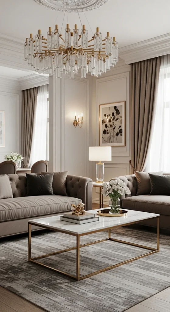 This design feels polished and elegant with a touch of drama. A velvet sofa in blush, navy, or emerald becomes the focal point. A marble coffee table with gold legs adds a refined finish. Metallic accents like gold mirrors or trays reflect light beautifully. A statement chandelier or crystal lighting enhances the atmosphere. Soft textures like faux fur throws balance the look and keep it comfortable.