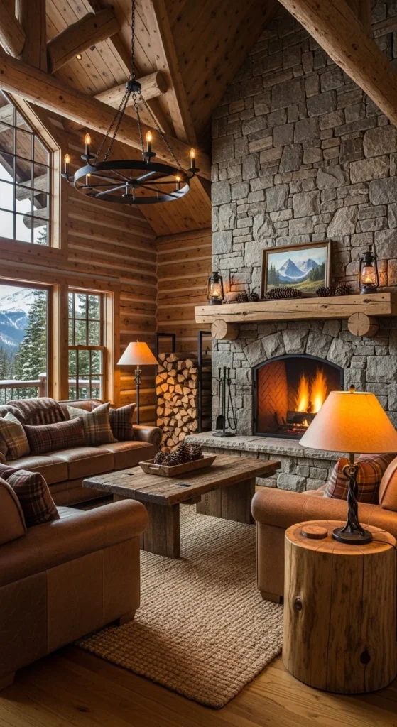 This space feels warm and grounded, perfect for relaxed evenings. A stone fireplace serves as the central feature of the room. Heavy wooden beams and natural wood furniture add structure and texture. Leather sofas or armchairs provide durable and comfortable seating. Wool blankets and textured rugs bring extra warmth. Soft, warm lighting makes the space feel inviting and calm.