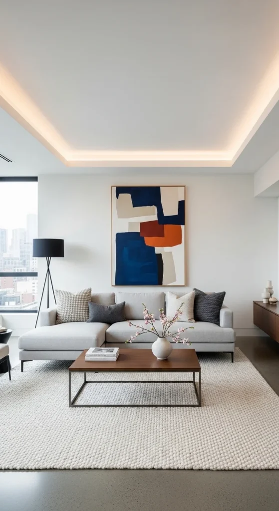 This style feels fresh and current with a clean, refined finish. Sleek furniture with simple shapes keeps the room looking neat. A neutral base paired with bold accents like black or deep tones adds contrast. Large abstract artwork creates a strong focal point. Surfaces stay mostly clear with only a few carefully chosen decor pieces. Layered lighting, including recessed lights and floor lamps, keeps the space well-lit.