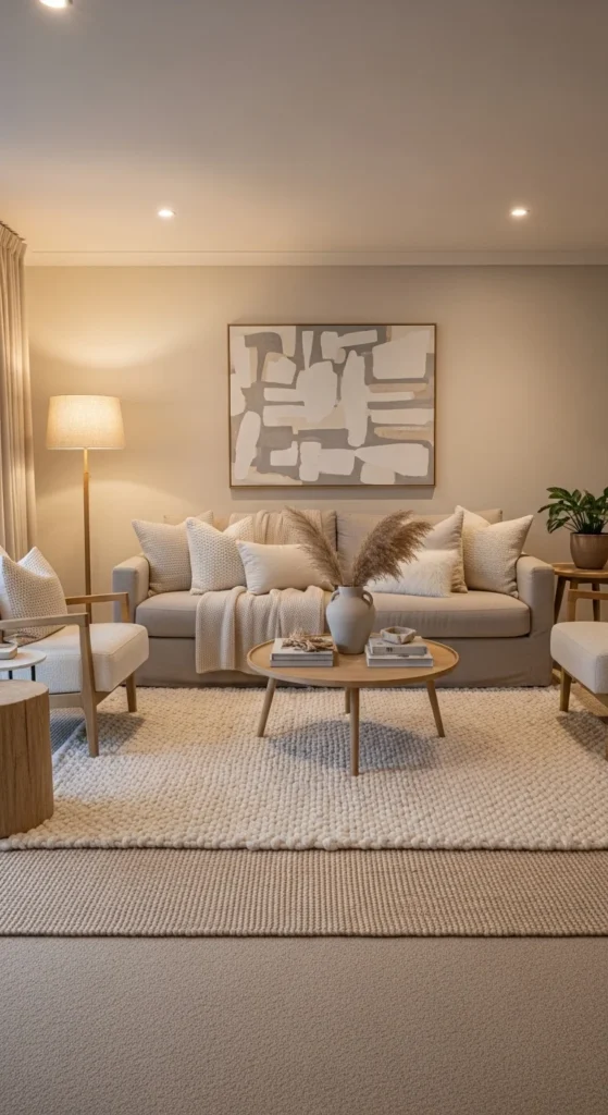 This design feels soft, calm, and quietly stylish. Shades of beige, cream, and soft brown create a warm base. Layered textures like linen, wool, and boucle add depth without using bold colors. A plush rug and cozy throw blankets enhance comfort. Simple decor such as ceramic vases keeps the look clean. Warm lighting ties everything together and adds a gentle glow.