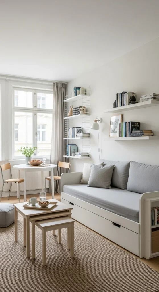 This design feels open and practical, even in a compact area. A small sofa or loveseat keeps the layout manageable. Multi-functional pieces like a storage ottoman or nesting tables save space. Light colors help the room feel larger and brighter. Mirrors reflect light and create the illusion of more space. Wall shelves replace bulky cabinets, keeping the floor area clear.