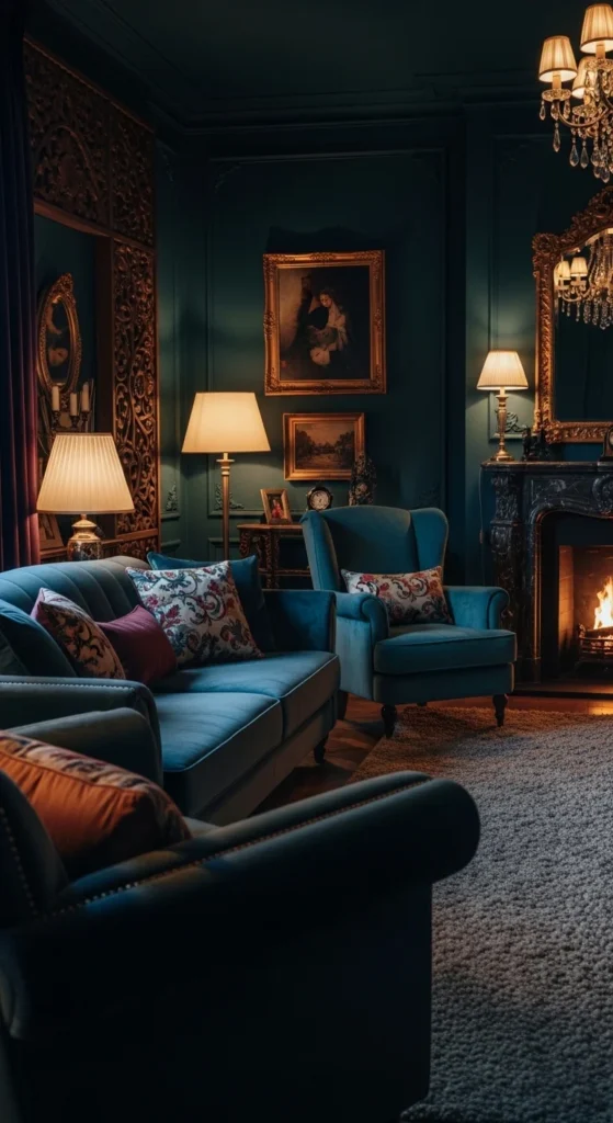 This space feels rich, cozy, and slightly dramatic in a comforting way. Deep wall colors like charcoal or navy set the tone. Velvet seating adds softness and texture. Warm, low lighting from table lamps creates a relaxed atmosphere. Metallic accents are used sparingly for contrast. Minimal decor allows the dark tones to stand out beautifully.