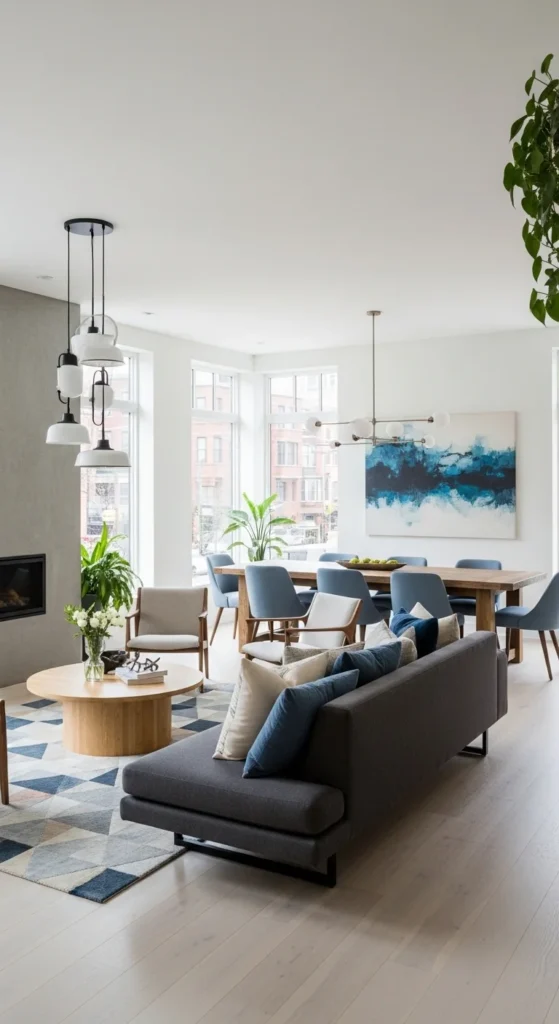 This design feels spacious and connected, perfect for modern living. A consistent color palette ties different areas together. A sectional sofa helps define the seating zone without closing off the space. A large area rug anchors the living area. The layout stays open and easy to move through. Lighting subtly separates each zone while keeping the overall look cohesive.
