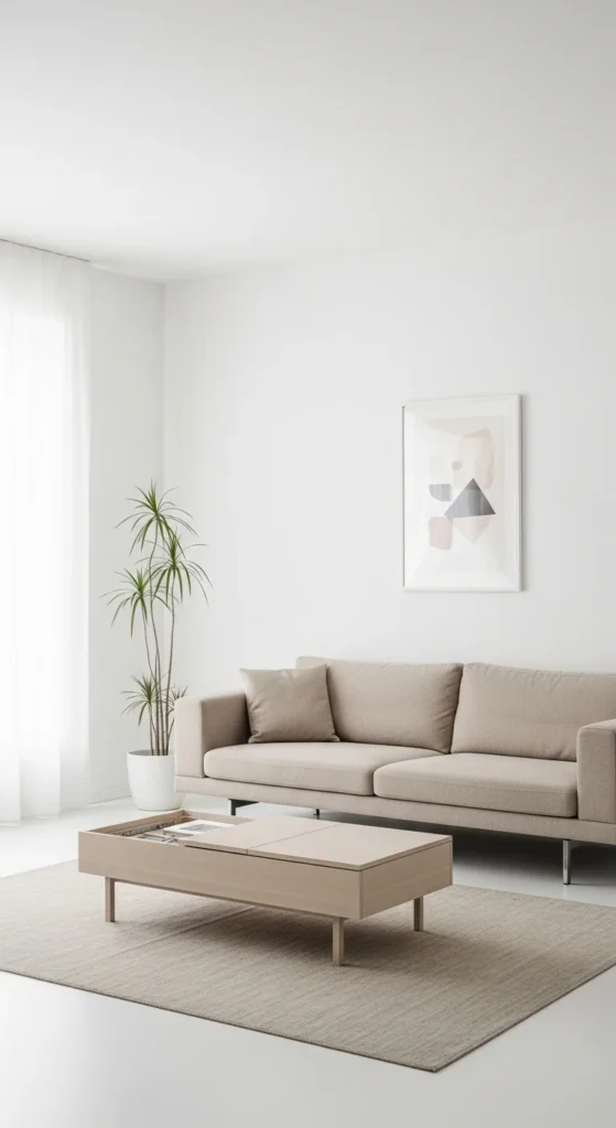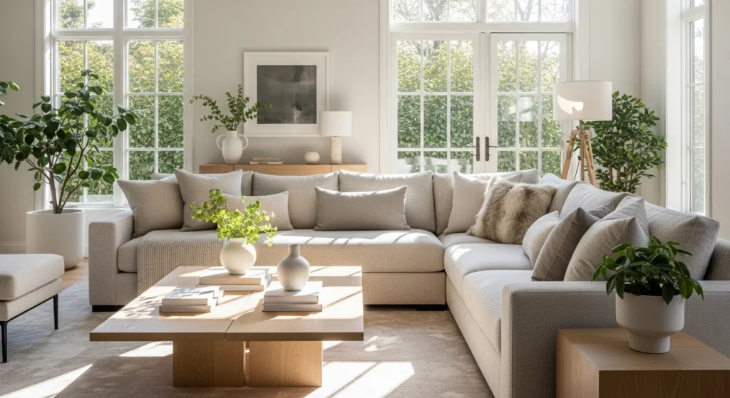 This style feels calm, open, and beautifully uncluttered. It creates a peaceful environment where every piece has a purpose and nothing feels overwhelming. A low-profile beige linen sofa paired with a slim wooden coffee table sets the tone for simplicity. Neutral shades like white, soft gray, and warm taupe keep the palette soothing and consistent. Hidden storage, such as built-in cabinets, helps maintain clean surfaces. A single sculptural floor lamp or a textured rug adds quiet interest without crowding the space, while sheer curtains allow natural light to softly fill the room.