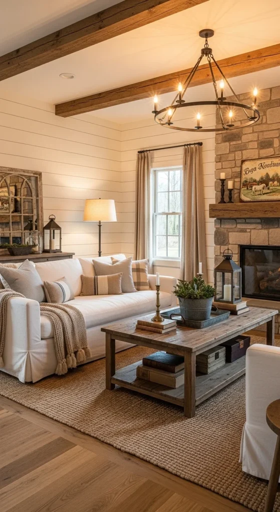 This design feels warm, relaxed, and instantly welcoming, like a quiet countryside retreat. A soft white slipcovered sofa layered with plaid or knit throws creates a comfortable seating area. Rustic elements like a distressed wood coffee table or a vintage trunk bring character into the room. Shiplap walls or wood paneling add texture and charm. Decor pieces such as ceramic vases, lantern-style lighting, and woven baskets enhance the cozy feel. Soft, warm lighting from table lamps completes the inviting atmosphere.
